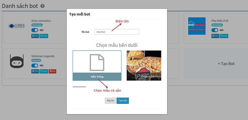 Chọn bot mẫu để tiết kiệm thời gian hoặc bỏ trống, nhớ phải điền tên Bot.