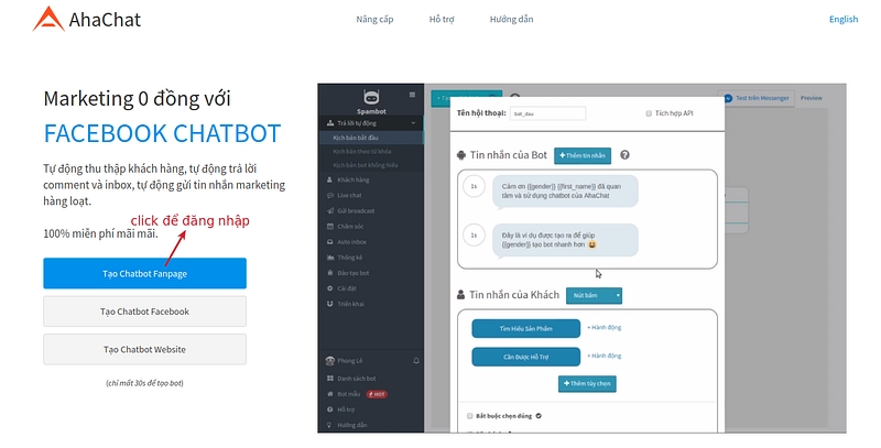 2: Tên hội thoại. 3: Tin nhắn văn bản của Bot, có thể dùng biến số {{gender}} để lấy giới tính và {{first_name}} để lấy tên của Khách hàng. 4: Tin nhắn hình ảnh của Bot 5: Cài đặt thời gian chờ xuất hiện của tin nhắn sau so với tin nhắn trước. Nếu tin nhắn càng dài nên đặt thời gian chờ càng lâu để có cảm giác chat với người. 6: Chọn loại tin nhắn của người dùng để trả lời (ở ví dụ này là nút bấm), ngoài nút bấm còn hỗ trợ: trả lời nhanh, văn bản, thẻ ảnh... 7: Thêm tùy chọn để thêm nút bấm. 8: Chọn rẽ nhánh để khi người dùng click vào nút bấm sẽ cho xuất hiện hội thoại tương ứng kế tiếp.
