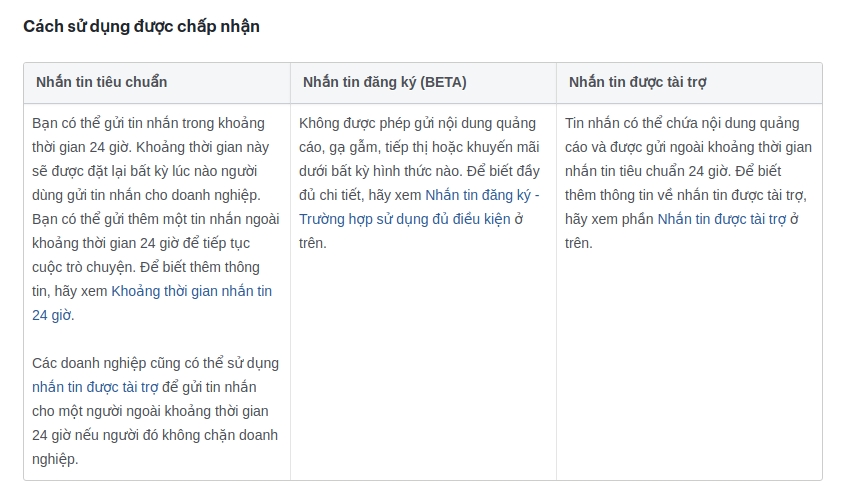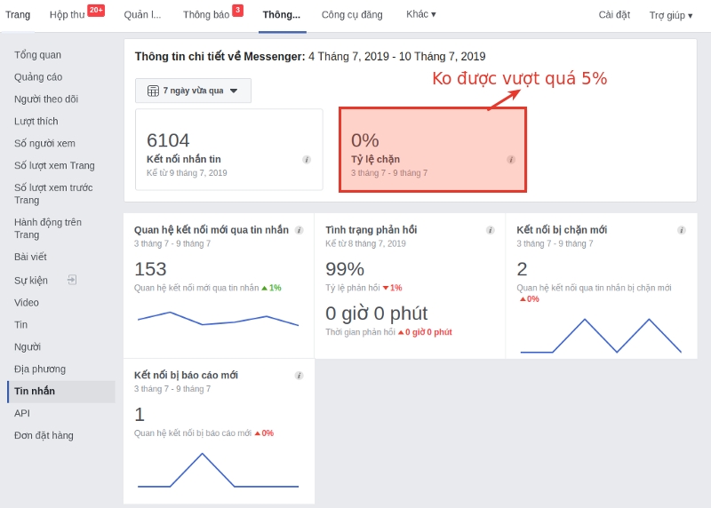 Đồng thời, sau mỗi đợt gửi tin, bạn phải vào Fanpage > Thông tin chi tiết để kiểm tra tỉ lệ chặn là bao nhiêu, nếu tỉ lệ chặn trên 5% thì bắt buộc phải đổi nội dung gửi broadcast. Ví dụ: https://www.facebook.com/PAGE_ID/insights/?section=navMessages (thay PAGE_ID thành page id của bạn)